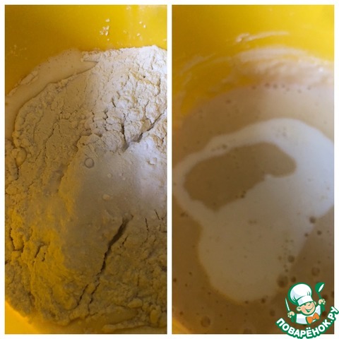 Ввести муку с разрыхлителем и продолжить взбивать тесто. Влить оставшееся молоко (100 мл). Взбиваем тесто, чтобы не было комочков. Испечь блины, дать им остыть.