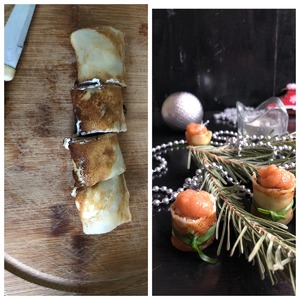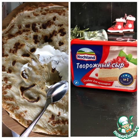 Остывшие блины смазываем щедро творожным сыром и закручиваем блин в рулетик.