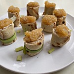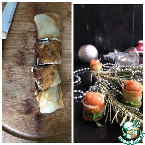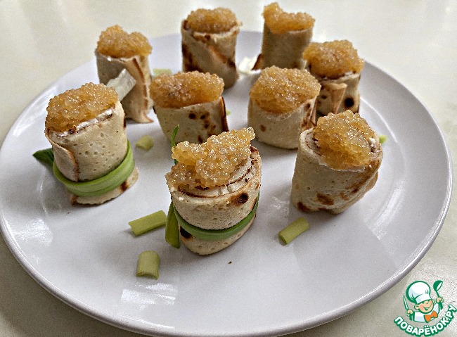 Каждый рулетик разрезаем на порционные кусочки, зелёным луком перевязываем по серединке каждую «шайбочку». Сверху выкладываем икру минтая.