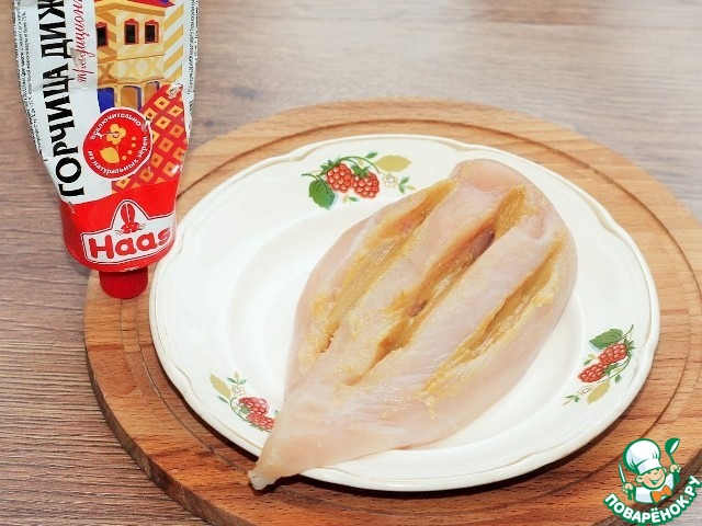1. Маринуем курицу. На куриной грудке делаем три глубоких надреза и щедро смазываем дижонской горчицей. Закрываем курицу крышкой и оставляем на столе, на 1 час.