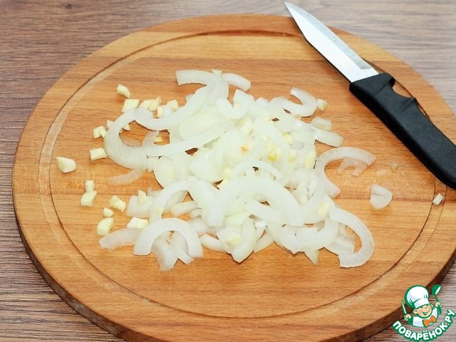 3. Очищенный лук и чеснок нарезаем: лук полукольцами и мелко чеснок. На разогретом подсолнечном масле обжариваем лук и чеснок до прозрачности.