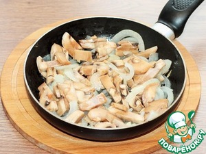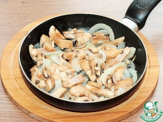 4. Подготовленные шампиньоны нарезаем дольками и обжариваем с луком до полуготовности.