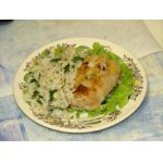 8. Маринованную грудку посыпаем приправой для курицы (0,5 ч. л.), солим и кладем на гарнир. Горчицу на курице оставляем. В куриные разрезы можно положить дольки картофеля. На картофельную массу, кладем кусочки сливочного масла.