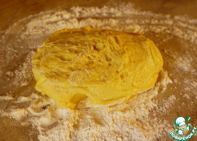 Оставляем его на час, чтобы подошло. Оно выходит не таким пышным, как мы привыкли, т. к. кукурузная мука и большое количество сливочного масла его утяжеляет, но результат после выпечки, выходит очень интересным.