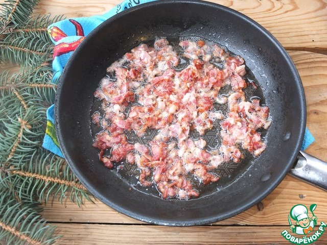 Бекон нарезаем и обжариваем на сухой сковороде до хруста.
