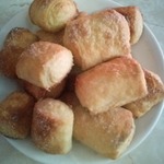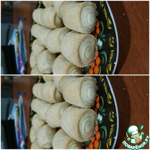 Нарезать "брусочками" примерно по 10 см и верхней стороной, там где нет шва, обмакнуть в сахар. -