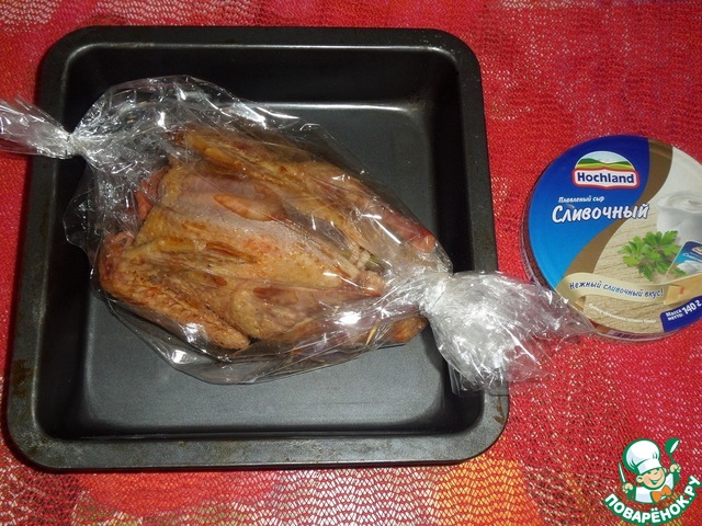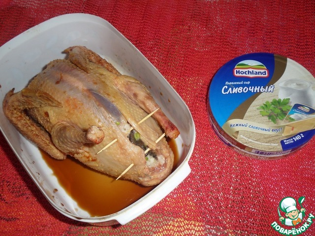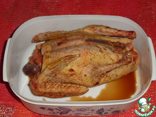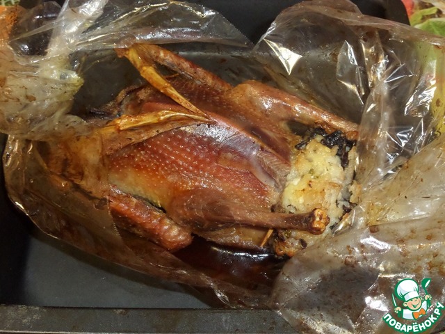 Помещаем противень с птичкой в разогретую духовку. Запекаем 1час 30минут при 180-200 градусах, ориентируясь на свою духовку.
