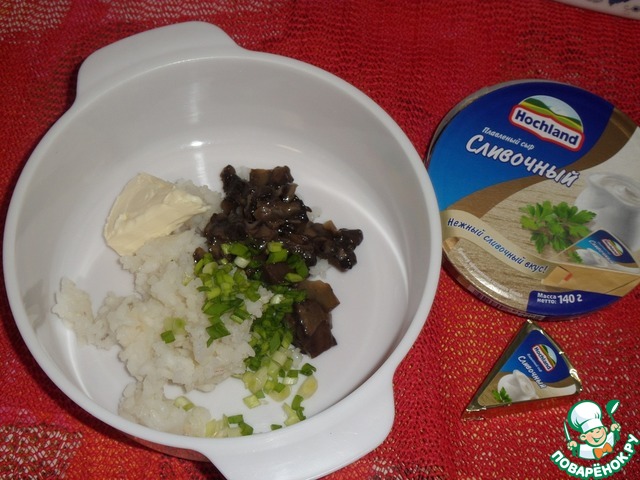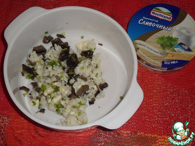В отдельную чашку выкладываем вареный рис, жареные грибы, зелень и сыр ТМ"Hochland".
