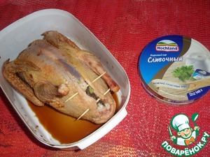 Через час фаршируем замаринованную птицу приготовленной начинкой. Брюшко скрепляем шпажками.