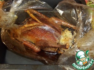 Перекладываем фаршированную птицу в пакет для запекания.