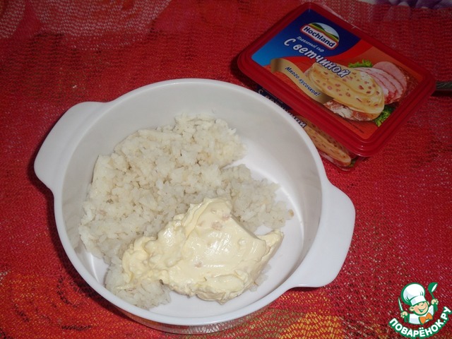 В чашку выкладываем вареный рис и плавленый сыр ТМ "Hochland".