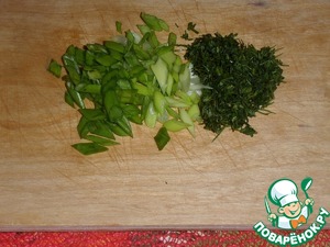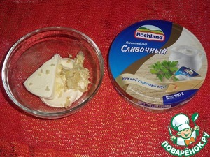 Готовим заправку. В чашечке смешиваем майонез, плавленый сыр ТМ "Hochland" и измельченный чеснок.