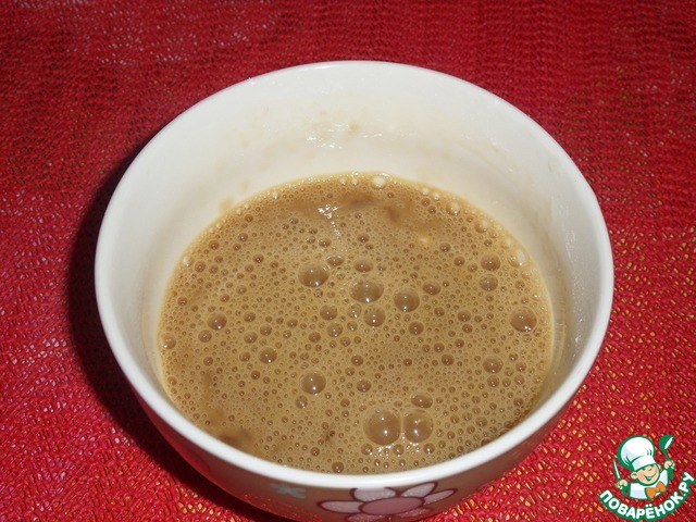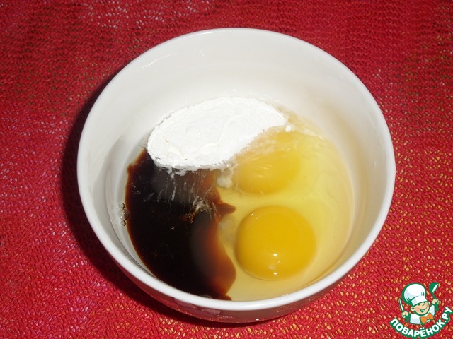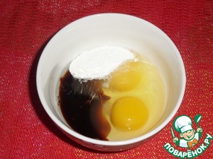 В чашку разбиваем 2 яйца. Добавляем соевый соус, растительное масло и кукурузный крахмал.