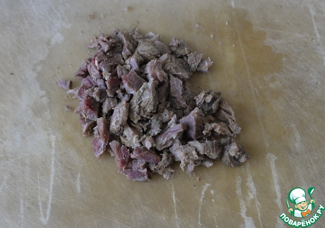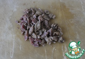 Берём любое запечённое мясо птицы, которое есть в наличии, у меня - запечённый гусь. Режем запечённое филе птицы мелкими кусочками.