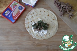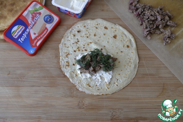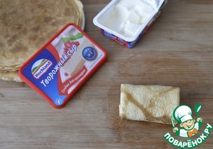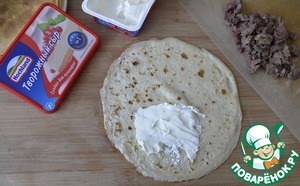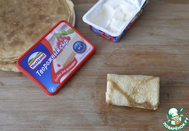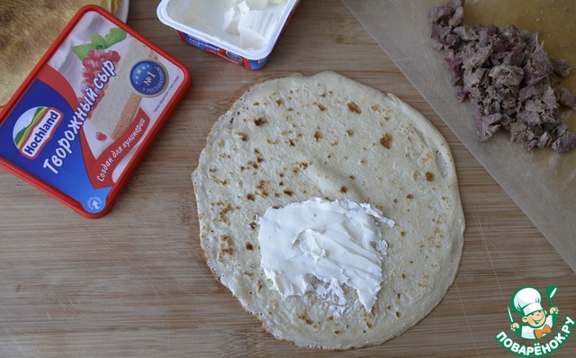 На блин кладём 1 ст. ложку творожного сыра, у меня Hochland. Немного размазываем по блину ножом.
