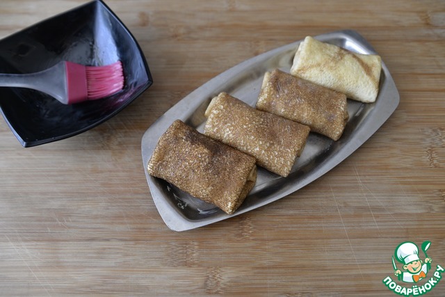 Растапливаем сливочное масло. Берём форму для выпечки, смазываем маслом, кладём фаршированные блинчики, смазываем кисточкой маслом. Ставим в нагретую до 200 градусов духовку, запекаем до румяности 20 минут.