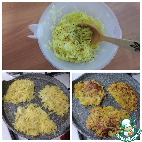 Я соус сделала на завтрак к драникам. На одну порцию я взяла 2 маленькие картофелины и половинку маленькой луковицы. Натёрла на тёрке лук, следом-картофель. Так он у нас не потемнеет дольше. Посолила, поперчила и деревянной ложкой вымесила. Деревянная ложка тоже не даст окисления и картофель будет светлым дольше. Обжарила на оливковом масле с обеих сторон. Это быстро.