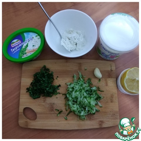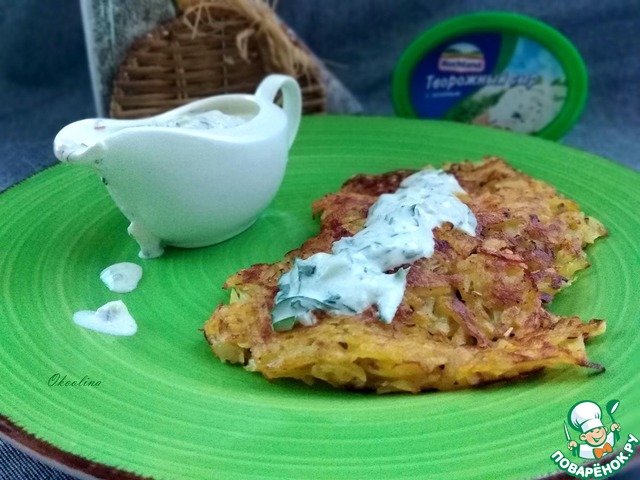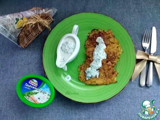Соус из творожного сыра с зеленью, в который я добавлю сметану, натёртый свежий огурец, петрушку и лимонный сок. Прекрасно гармонирует с овощами. В моём сегодняшнем случае соус я сделала к драникам на завтрак. Замечательное сочетание.