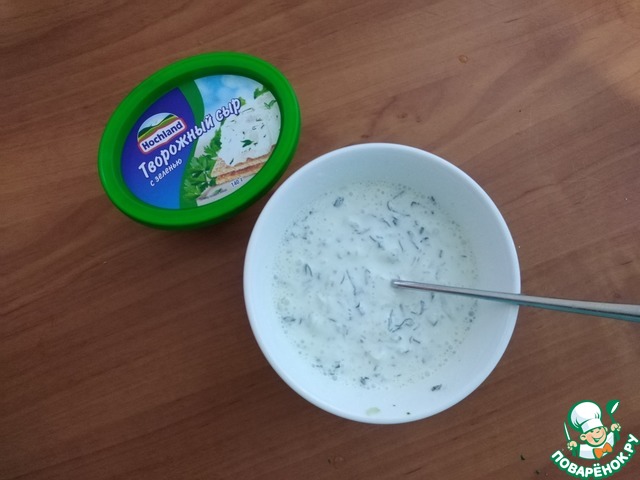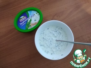 Для соуса я буду использовать творожный сыр Hochland с зеленью. Подойдёт и сливочный той же марки. В подходящей посуде соединяем сыр творожный, сметану, чеснок, петрушку, огурец. Я солить соус не буду, а добавлю в него лимонный сок, отжав его из одной дольки лимона. Для меня оптимальный соус по вкусу. Готов.
