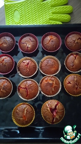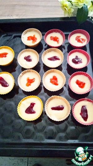Разложить тесто по формочкам, в середину добавить фруктовый джем. У меня абрикосовый и вишневый.