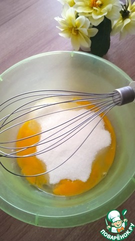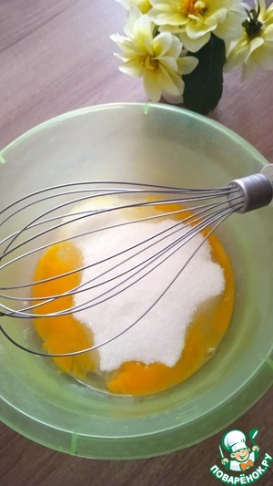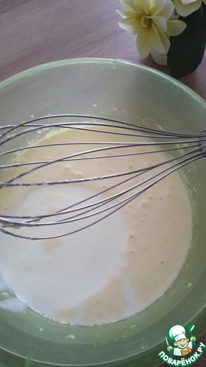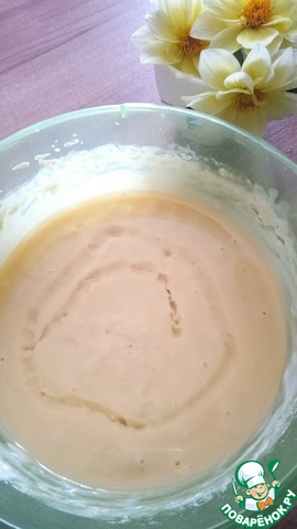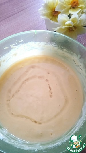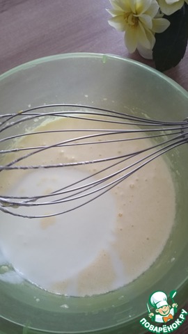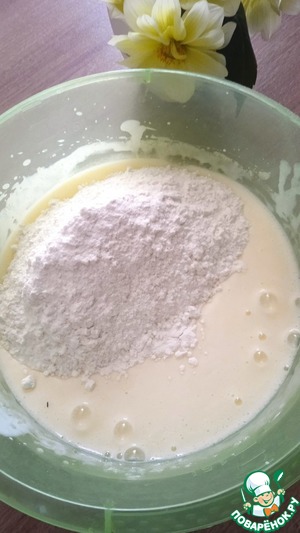 Муку перемешать с разрыхлителем, просеять, добавить к яично-кефирной смеси, взбить.