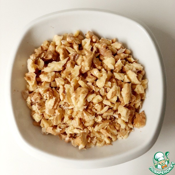 Орехи поджарить на сухой сковороде, порубить ножом.