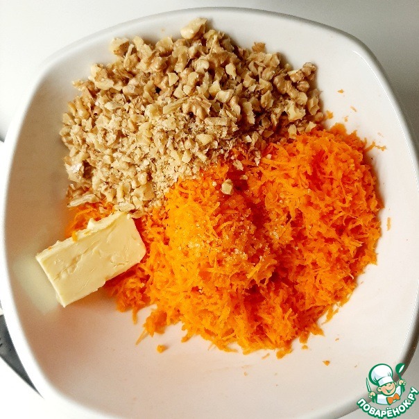 К моркови добавить сливочное масло комнатной температуры, орехи и соль, перемешать.