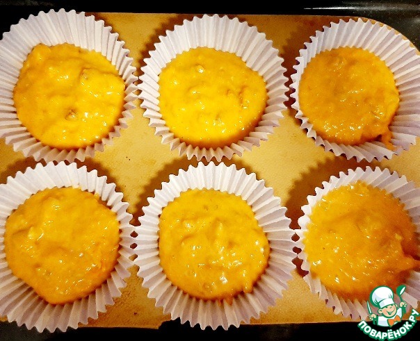 Разогреваем духовку 170°C. В форму для кексов выкладываем бумажные формочки. Заполняем каждую форму тестом на две трети и выпекаем в разогретой духовке 20-25 минут. Готовность проверяем деревянной шпажкой.