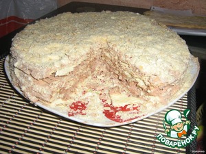 Ну и, собственно говоря, начинаем кремом обмазывать каждый корж, хорошо пропитывая края, сверху посыпаем измельченным коржиком, можно еще и шоколадом тертым.