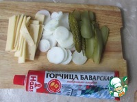 Нарезаем луковицу кольцами, сыр пластинками, огурцы лентами.