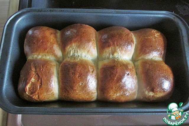 Необходимо 400 г готового дрожжевого теста разделить на 8 частей по 50 г каждая. Скатать шарики и уложить в форму. Размер моей формы: 12х22х6 см.