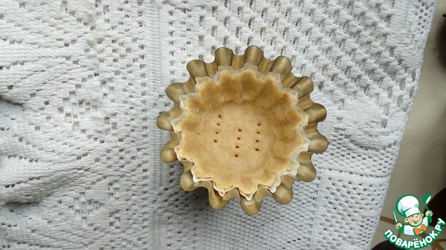 Тесто делим на кусочки и формируем корзиночки, равномерно распределяя по формочкам. Хорошо прижимаем на стыке дна с боковой стенкой. Дно накалываем вилкой, чтобы при выпечке не вздувалось.