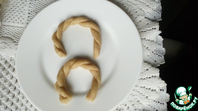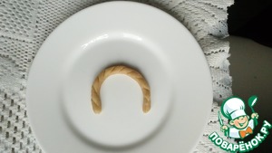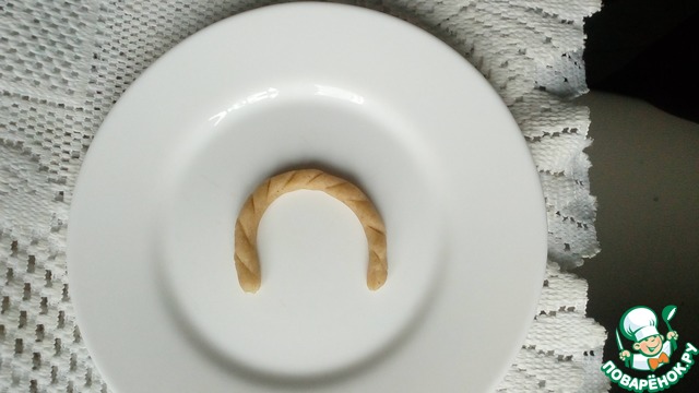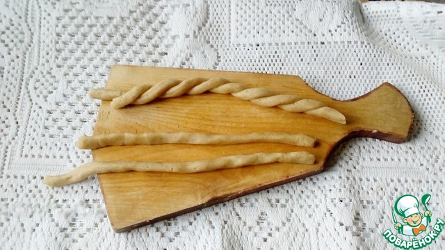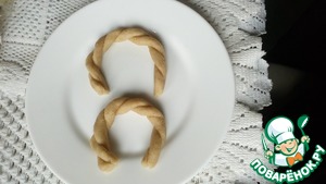 Из оставшегося теста формируем "ручки". Для этого раскатываем тонкие жгутики и соединяем их попарно.