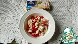 Нарезаем ветчину, перец и плавленный сыр кубиком, перемешиваем.