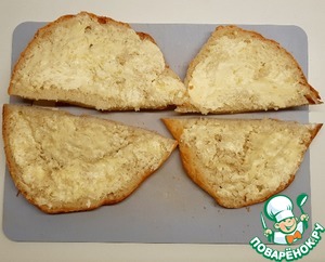 Намазать хлеб маслом с чесноком и запечь в духовке 5 минут.