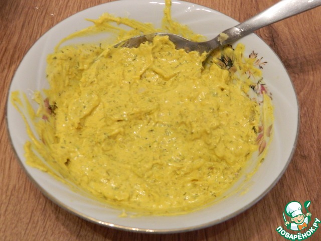 • Смешаем все ингредиенты. К сметане добавим измельченный чеснок,