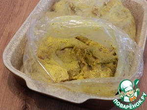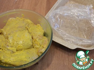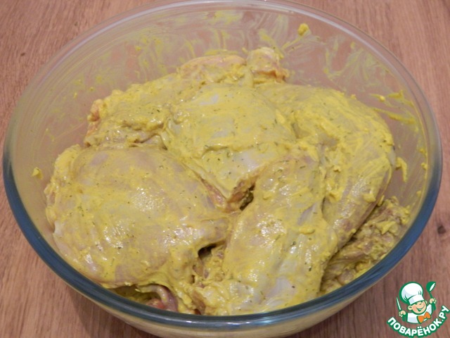 соль, смесь перцев, куркуму, хмели сунели, горчицу, приправу к мясу. С солью осторожно, так как еще будет соевый соус с медом в конце приготовления кролика, который используется для обмазки мяса для получения румяной корочки.