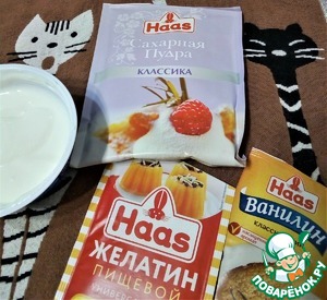 Смешать йогурт, творог, сахарную пудру. Добавить ванилин. При постоянном помешивании влить желатин.