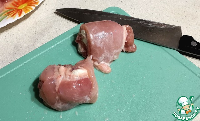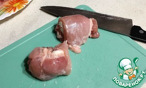 В качестве основы в оригинале рецепта используют куриную грудку, моей семье больше пришлось по вкусу куриное бедро. Для удобства я покупаю уже готовое филе куриного бедра.