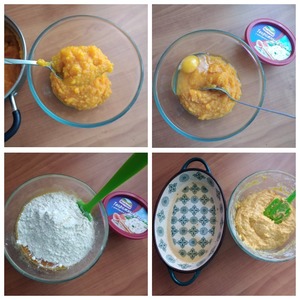 Делаем тесто. Берём 5 ст л пюре. Пюре в ложке берётся с горкой (см. фото). Разбиваем яйцо, соединяем. Добавляем 5 ст л муки. Ложки муки тоже берутся с горкой. Силиконовой лопаточкой замешиваем тесто. Солим по вкусу. Добавляем 1 ст л масла оливкового, тимьян и базилик по щепотке. Тесто липкое. Форму смазываем маслом 0,5 ст л и ещё 0,5 ст л оставляем, чтобы смазать верх до выпечки.