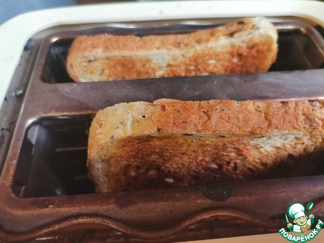 Ломтики тостового хлеба поджариваем в тостере или на сковороде. У меня тостовый ржаной хлеб с семечками.