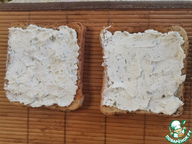 Творожный сыр в блендере смешиваем с маринованным корнишоном. Или покупаем в магазине готовый творожный сыр с солеными огурчиками. Намазываем тосты сыром.