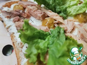 Сверху укладываем кусочки консервированного тунца и горчицу.