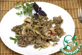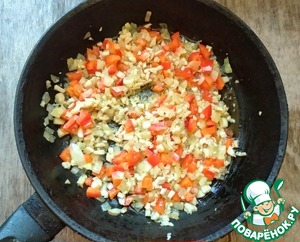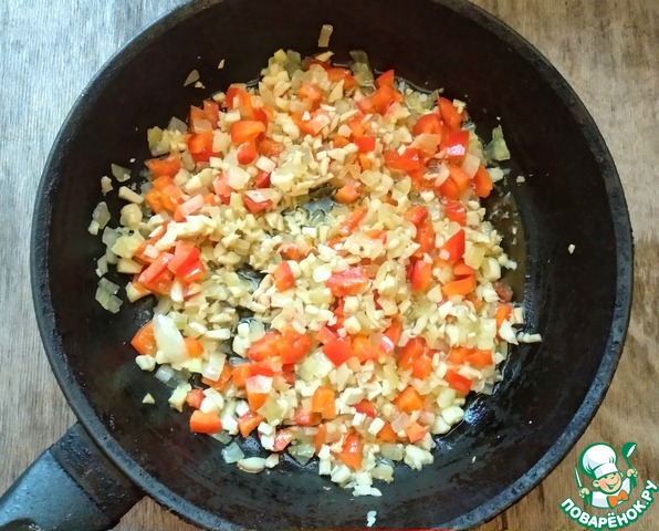 Лук почистить, помыть, мелко порезать. Болгарский перец помыть, очистить от семян, мелко порезать. Соединить в сковороде нарезанный лук, перец и ножки грибов. Обжаривать в оливковом масле 5-7 мин.