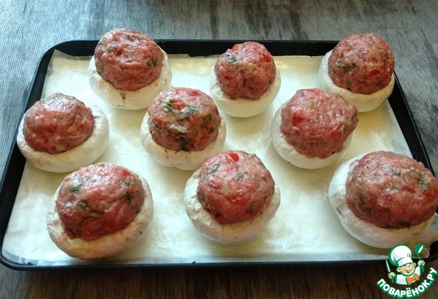 Из полученной массы сформировать фрикадельки и положить их сверху шляпок шампиньонов. Фаршированные грибочки переложить на застеленный и смазанный противень. Готовить в духовке, заранее разогретой до 180 градусов, 25-30 мин.