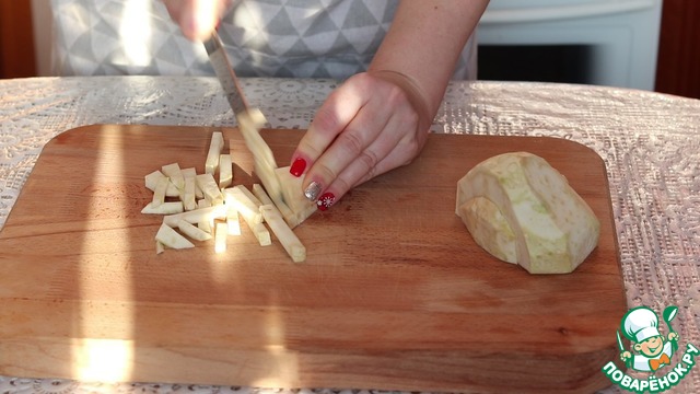 Когда фасоль практически готова. Отправляем в кастрюлю корень сельдерея. И варим практически до готовности сельдерея.