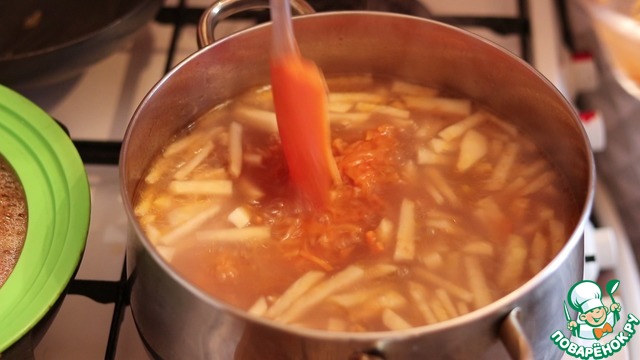 Добавляем 50 мл. бульона. Тушить 10 мин. Если капуста кислая можно добавить немного сахара.