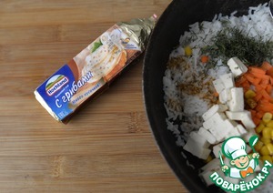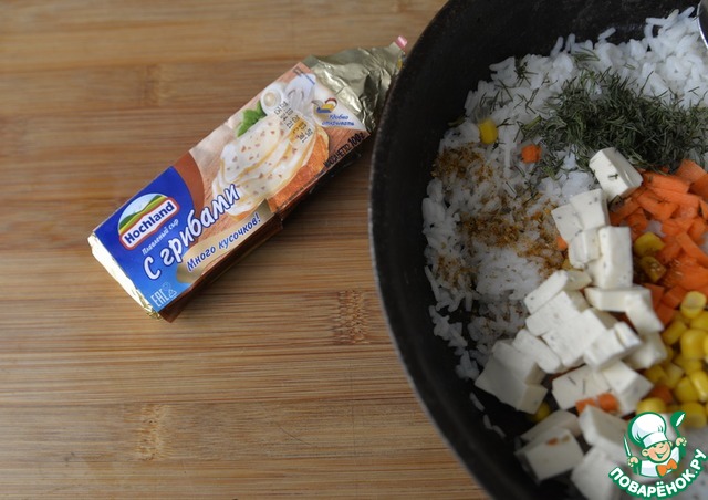 Плавленный сыр режем кубиками, у меня Hochland с грибами. Кладём в рис.