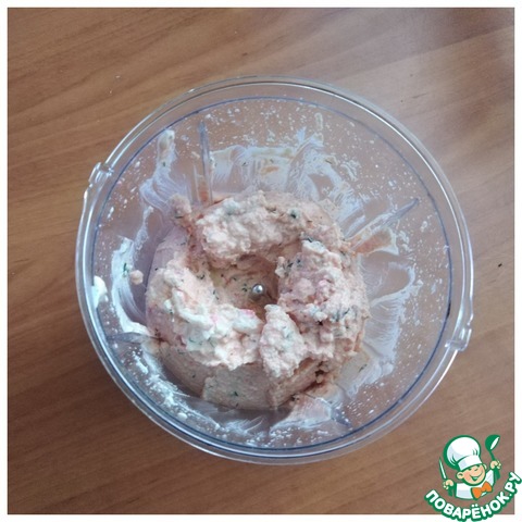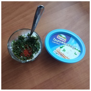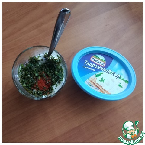 В посуду выкладываем творожный сыр, сметану, укроп порезанный, паприку.