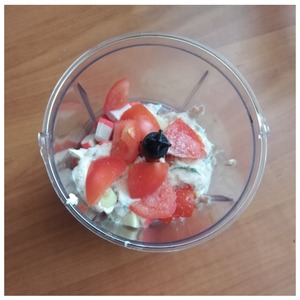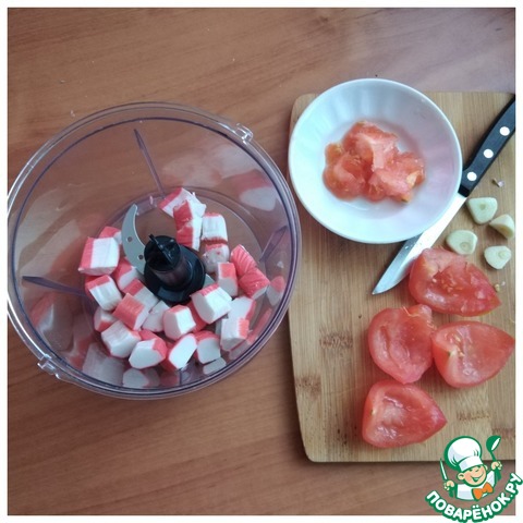 Если помидор у вас сочный, то у него нужно убрать серединку. Её можно потом использовать в другом блюде. Оставляем лишь мясистую часть. В чашу блендера выкладываем порезанные крабовые палочки.